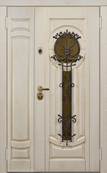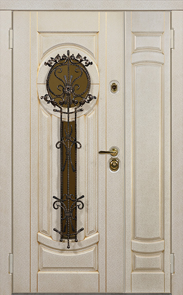 Двухстворчатая парадная дверь с ковкой и стеклом белая №30 — это сочетание красоты и надёжности. Конструкция из профильной трубы 50х25 мм и металлического листа толщиной 2 мм обеспечивает долговечность и стойкость к внешним воздействиям. Элементы ковки придают двери изысканный вид, а стеклопакет позволяет создать атмосферу лёгкости и прозрачности. Внешняя и внутренняя отделка выполнены из плиты МДФ, что делает дверь не только привлекательной, но и устойчивой к механическим повреждениям. Для дополнительной герметичности используются уплотнители с двумя контурами, а блокираторы обеспечат безопасность. Вариативность размеров и возможность добавления дополнительных опций, таких как шумо- и теплоизоляция, делают эту модель универсальной для установки в любом интерьере. Двухстворчатая парадная дверь с ковкой и стеклом белая №30 от производителя: быстрое изготовление и монтаж в Бронницах, индивидуальные размеры, широкий выбор материалов и фурнитуры, официальная гарантия до 10 лет.